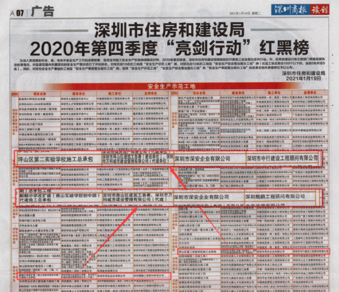 1月19日,深圳市住房和建設局2020年第四季度“亮劍行動”紅黑榜公布,深安企業承建的麒麟中學改擴建項目和坪山第二實驗學校項目獲列“紅榜”工地。