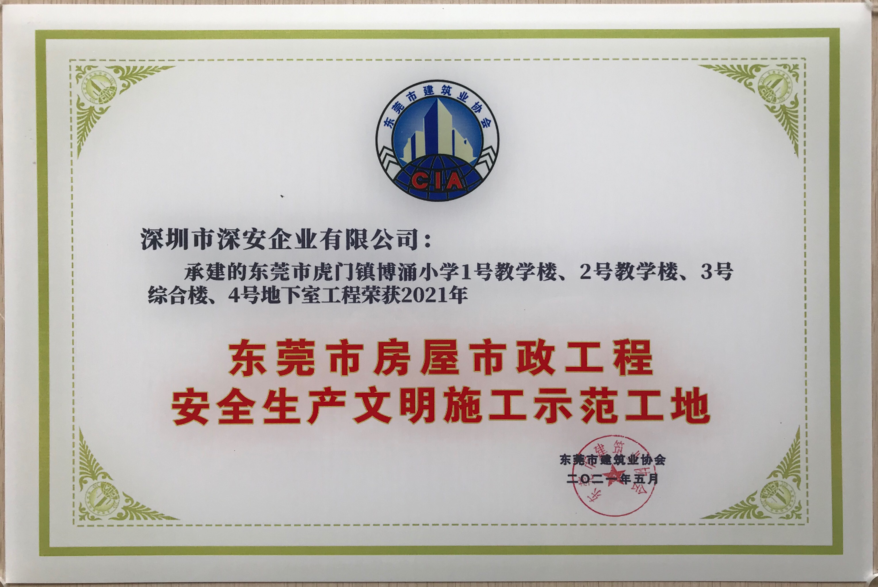 近日,深安企業承建的東莞市虎門鎮博涌小學項目獲東莞市建筑業協會授予的2021年“東莞市房屋市政工程安全生產文明施工示范工地”榮譽稱號。