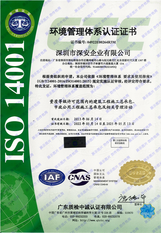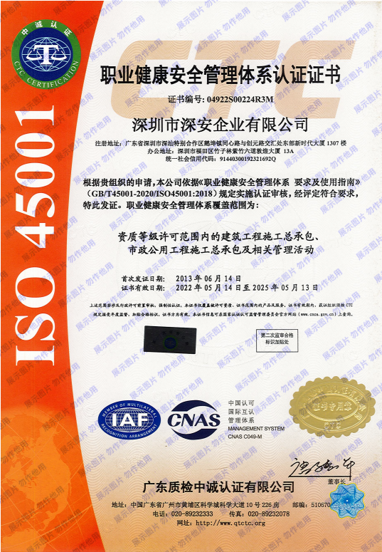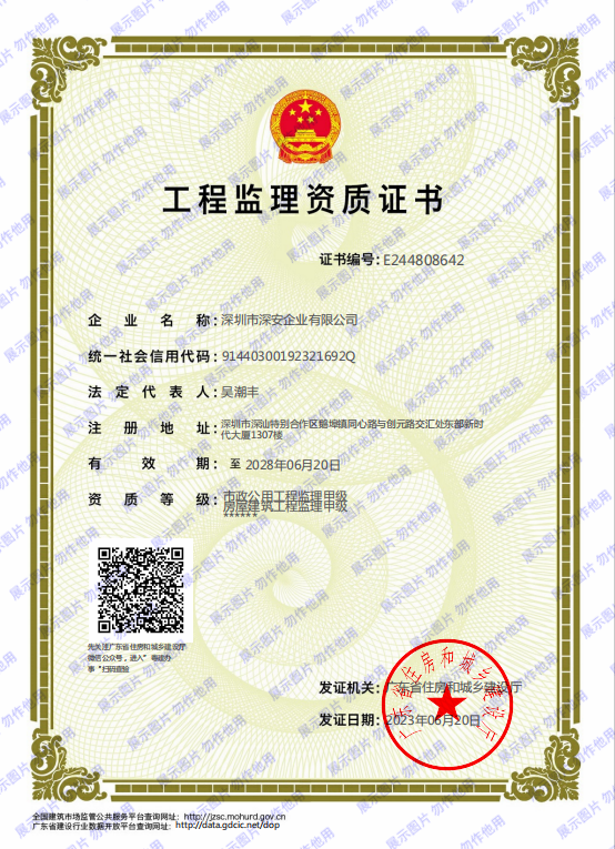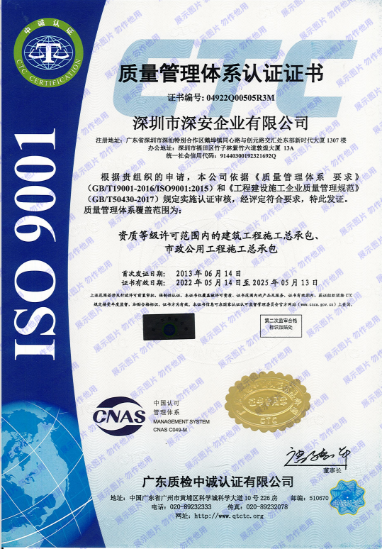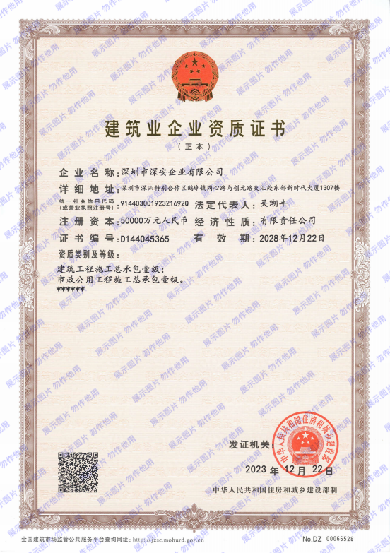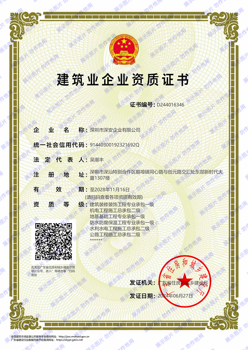 建筑裝修裝飾工程專業承包一級、機電工程施工總承包二級、地基基礎工程專業承包一級、防水防腐保溫工程專業承包一級、水利水電工程施工總承包二級、公路工程施工總承包二級